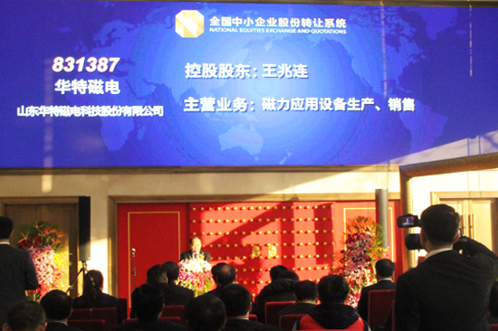 12月8日上午,山東華特磁電科技股份有限公司“新三板”掛牌儀式在全國(guó)中小企業(yè)股份轉(zhuǎn)讓有限責(zé)任公司隆重舉行。濰坊市金融工作辦公室副主任張新華、臨朐縣委常委、常務(wù)副縣長(zhǎng)衣利民、臨朐縣金融工作辦公室主任高凌利、臨朐縣城關(guān)街道黨工委書(shū)記沈明新、臨朐縣東城街道黨工委書(shū)記孫傳坤、山東華特磁電科技股份有限公司董事長(zhǎng)王兆連及公司股東和高管、臨朐縣相關(guān)企業(yè)負(fù)責(zé)人出席本次掛牌儀式。