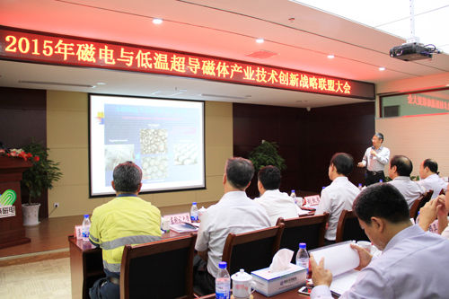 金秋送爽,丹桂飄香。9月19日,2015年中國磁電與低溫超導磁體應用產業技術創新戰略聯盟年會在中國五鎮之首東鎮沂山腳下,山東省濰坊市臨朐縣召開。來自全國各地的聯盟成員單位代表、科研院所和行業協會的領導專家,相聚一起,共商發展大計。武漢理工大學資環學院院長、墨西哥國家科學院院士宋少先教授,中國冶金礦山機械協會秘書長劉效良,中國重型機械協會洗選設備專委會秘書長呂英凡,澳大利亞中信泰富技術總監張長久教授級高工,東北大學土木資源工程學院副院長韓躍新教授,河北鋼鐵集團礦業有限公司總經理助理鄭衛民教授級高工、礦山研究設計院院長南世卿博士,中鋼集團馬鞍山礦山研究院有限公司副總工孫炳泉教授級高工、選礦所所長楊任新教授級高工,鞍鋼礦業集團科技部陳占金教授、礦業設計院總設計師陳強教授級高工,蘇州中材非金屬工業設計院于陽輝高工,中國地質調查局成都礦產綜合利用研究所研究員張裕書,中國地質科學院鄭州礦產綜合利用研究所劉磊主任,中科院高能物理研究所超導磁體工程中心副主任趙玲高工,山東科技大學化工學院副院長呂憲俊教授,華北理工大學礦業學院原院長張錦瑞教授、選礦系主任趙禮兵博士,山東華聯礦業公司副總經理亓中華, 山東興盛礦業集團秦來成高工,西部超導材料科技有限公司梁朝暉處長,山東華建鋁業集團有限公司蔣波部長,中冶北方設計院選礦所所長孟光棟教授級高工,建龍礦業集團董事長苑占永,萊蕪礦業董事長亓俊峰,唐山陸凱科技有限公司董事長李松奕,威海海王旋流器有限公司董事長黃愛秀,山東理工大學孟凡濤教授,濟寧學院李光葉博士, 山東乾舜礦冶科技股份有限公司董事長馮婕,以及來自中南大學、魯南礦業、臨礦集團、廟溝鐵礦、中關鐵礦等四十多家單位一百多名代表和山東電視臺、《中國礦業報》、《資源再生雜志》、臨朐電視臺等媒體出席聯盟大會。