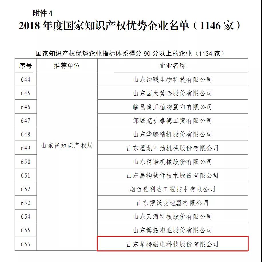 根據(jù)“國知發(fā)管函字〔2018〕158號”文件,經(jīng)企業(yè)申報,各省、自治區(qū)、直轄市推薦,國家知識產(chǎn)權(quán)局審核,并經(jīng)社會公示,確定山東華特磁電科技股份有限公司等1146 家企業(yè)為2018年度國家知識產(chǎn)權(quán)優(yōu)勢企業(yè),新一輪或新確定國家知識產(chǎn)權(quán)示范企業(yè)、優(yōu)勢企業(yè)建設(shè)工作期限自2018 年8月至2021年7月。
