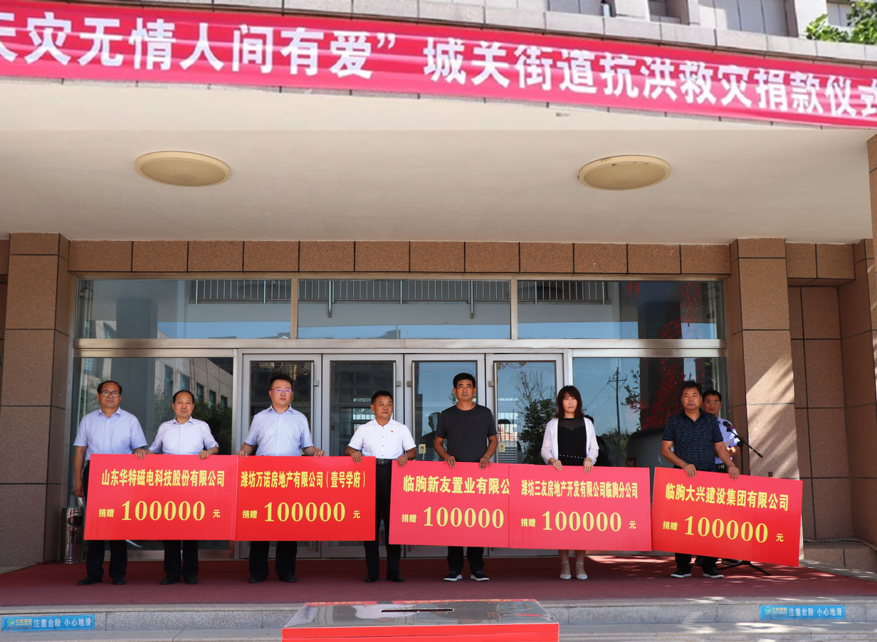 8月17日上午,城關街道黨工委率先組織舉辦“天災無情 人間有愛”抗洪救災捐款活動,活動號召街道上下繼續發揚抗洪精神,堅定信心,克難奮進,全力奪取恢復重建工作的全面勝利。華特公司董事長兼總裁王兆連代表公司出席活動并捐款10萬元。