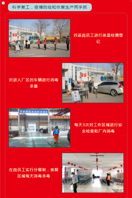 為了深入貫徹和落實(shí)上級(jí)黨委政府有關(guān)組織企業(yè)復(fù)工復(fù)產(chǎn)的決策部署,華特公司積極響應(yīng)、迅速行動(dòng),在確保疫情防控安全的前提下,第一時(shí)間開(kāi)展復(fù)工員工防疫核查管控,多渠道加大疫情宣傳力度,緊急籌備疫情防控物資質(zhì),建立疫情防控架構(gòu)和機(jī)制,開(kāi)展工廠各區(qū)域全面防疫消毒、滅菌消殺處理以及提交復(fù)工復(fù)產(chǎn)申請(qǐng)材料等各項(xiàng)準(zhǔn)備工作,確保公司所有的疫情防護(hù)措施做到位,全方面保障員工復(fù)工后的身體安全。目前,在城關(guān)街辦、縣經(jīng)信局及縣委縣政府的大力支持和指導(dǎo)下,經(jīng)臨朐縣新型冠狀病毒感染肺炎防控領(lǐng)導(dǎo)小組(指揮部)辦公室連夜批復(fù),公司順利通過(guò)兩級(jí)復(fù)產(chǎn)驗(yàn)收,如期按計(jì)劃復(fù)工復(fù)產(chǎn)。